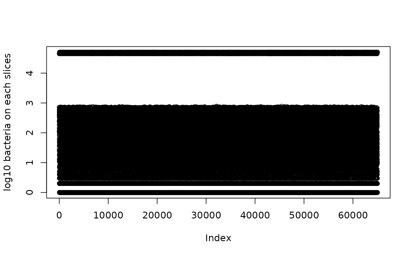 plot(log10(Res$N[1, ]), ylab = "log10 bacteria on each slices")